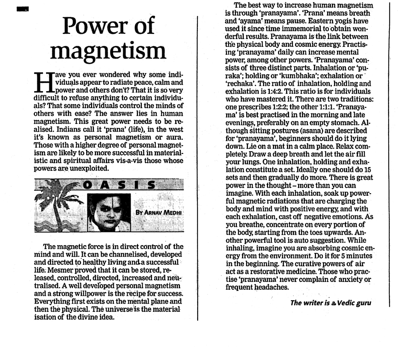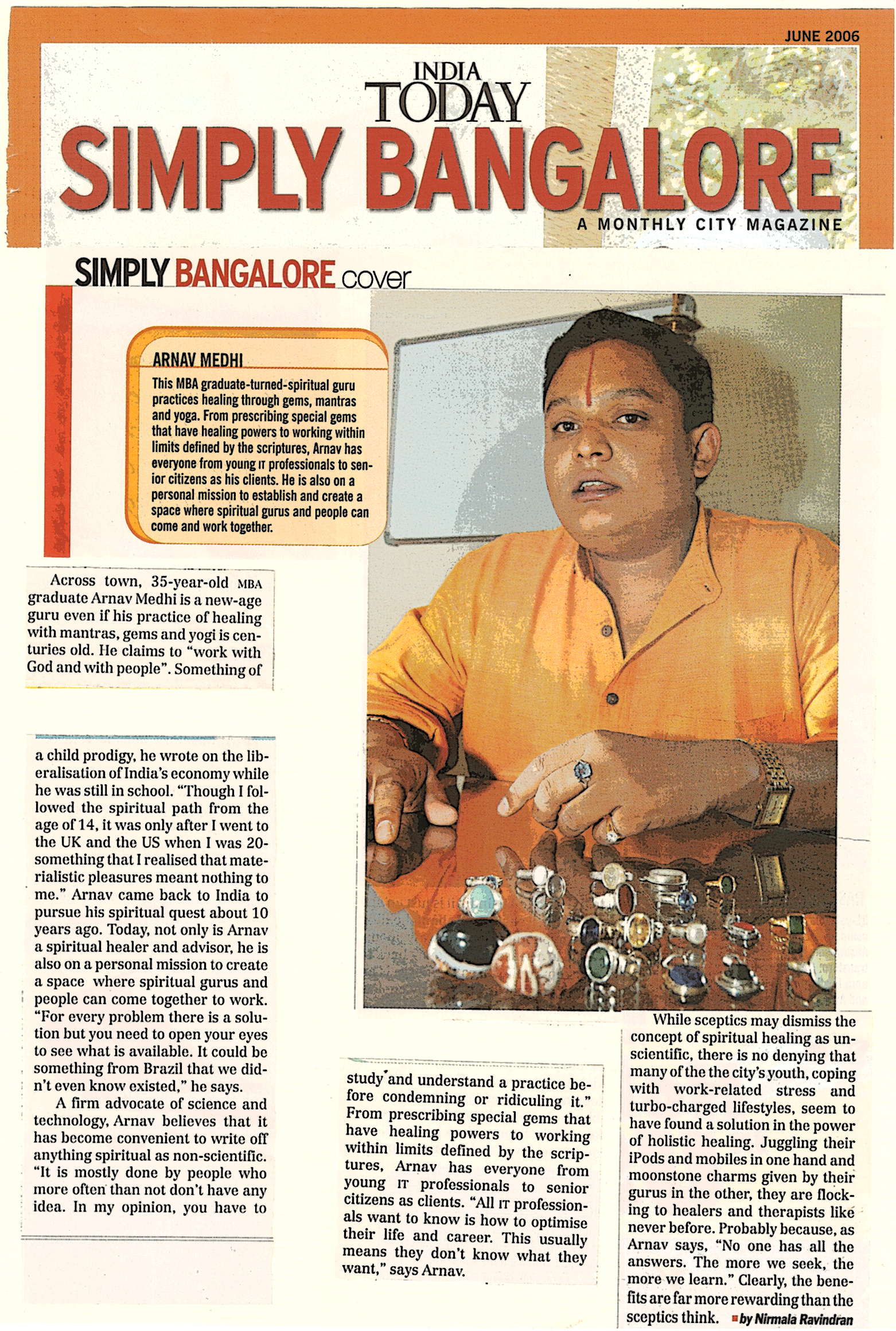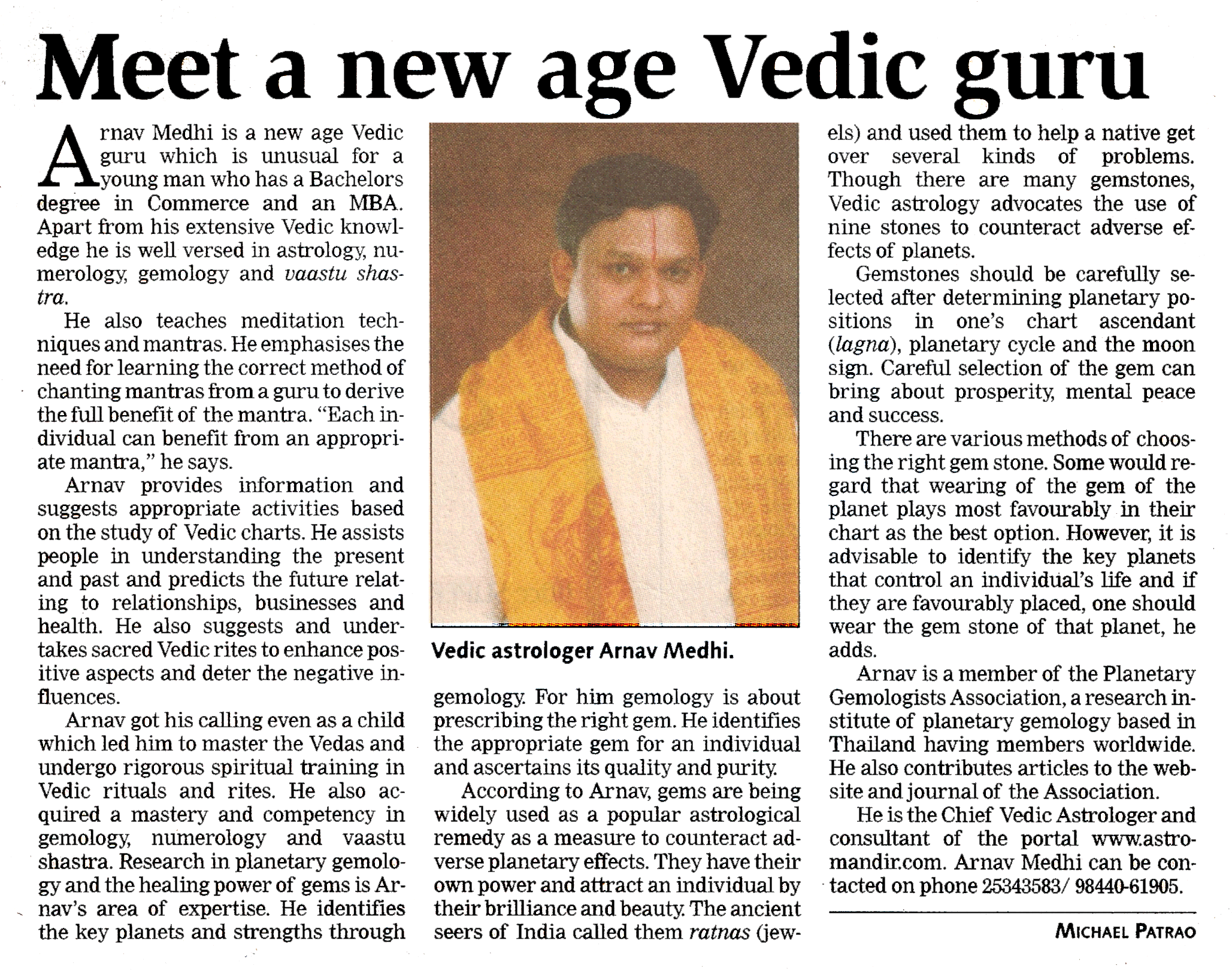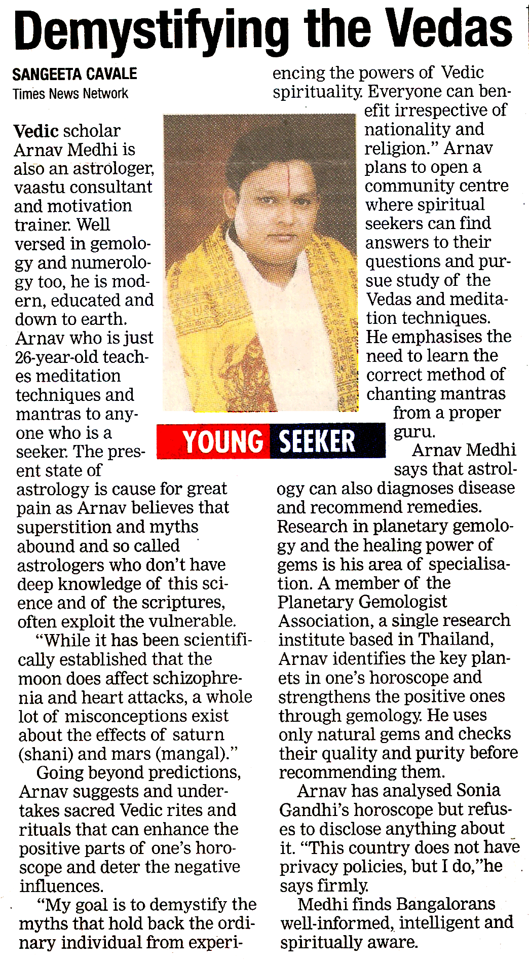 (earlier Arnav Medhi) would be as a Vedic Guru. However his aura and acclaim is not limited to the extensive Vedic knowledge or spiritual ambience that surrounds him. As a person with infinite grasp of a wide array of Indian competency areas – be it astrology, numerology, gemology, Vaastu Shastra, tantra, mantra and beyond - he is the personification of a neo-modern guide and guru for the new millennium citizens – be it Indians or Non-Indians. Guruji Shrii Arnav is a true Guru, for the seekers of Dhyan Sadhana (Meditation techniques) and Mantra Sadhanas. While the term Vedic may have Hindu connotations – his applications and processes find people of varied religious relating with him quite easily.