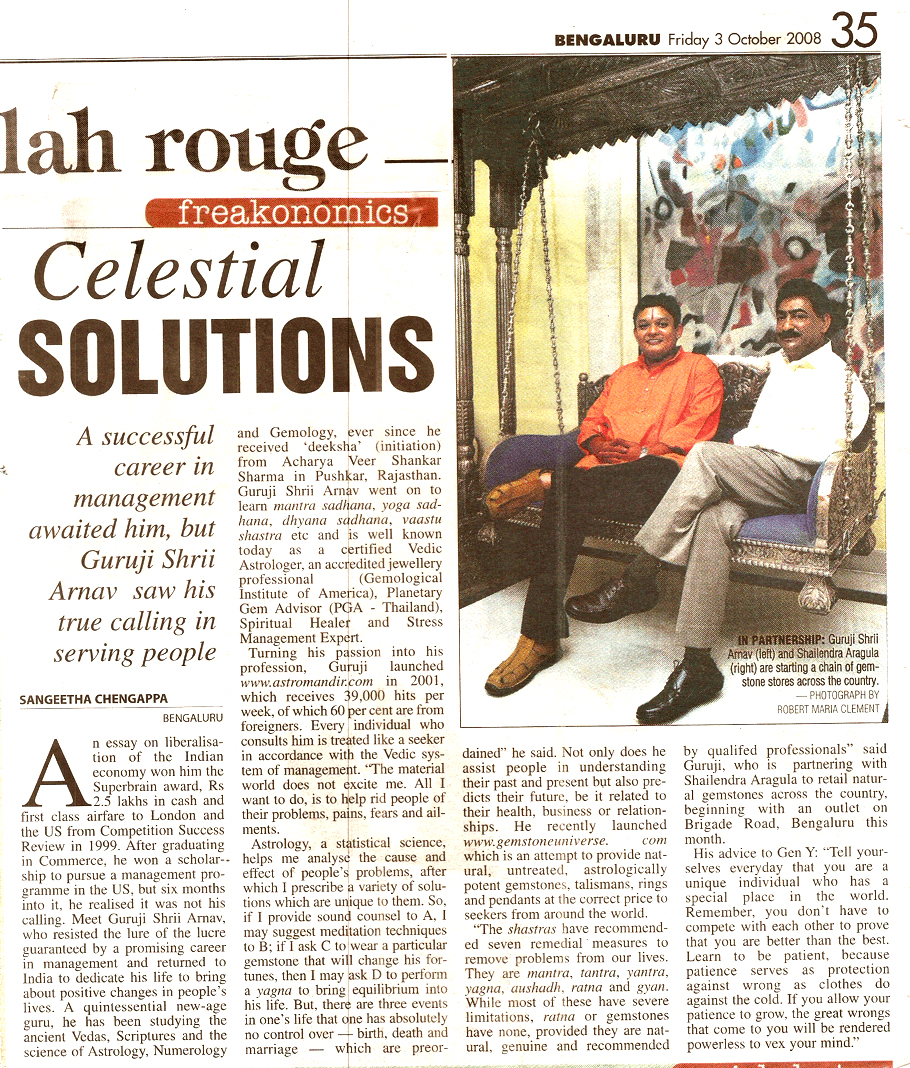 Guruji Shrii Arnav has found international claim with a diligent list of followers who have been touched deeply by his abiding faith and ability to positively influence and affect their lives. The Guru helps people of all faith and backgrounds to seek answers and solutions to the most complex factors of their lives. He uses the knowledge and practice of the Vedas and other spiritual texts in association with the scientific factors of gemology, astrological charts, and his own spiritual capacity - to prove successfully the power of prayers and Vedic rituals and the influence of varied controlled factors that can positively effect every ones lives.